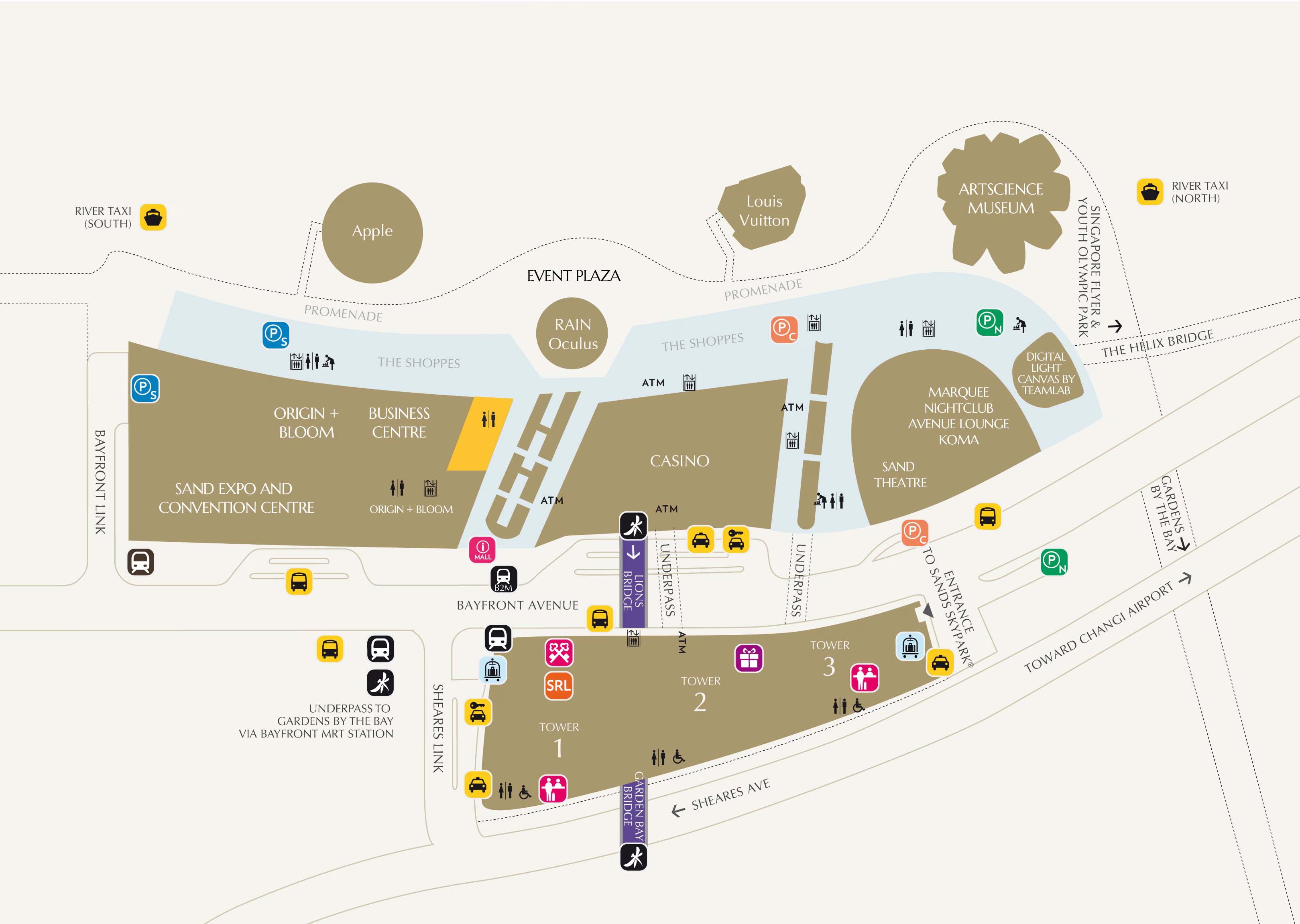 The jetty is situated at the south Promenade, near to The Shoppes (3-minute walk), Sands Expo & Convention Centre (5-minute walk), and Hotel Tower 1 (8-minute walk).